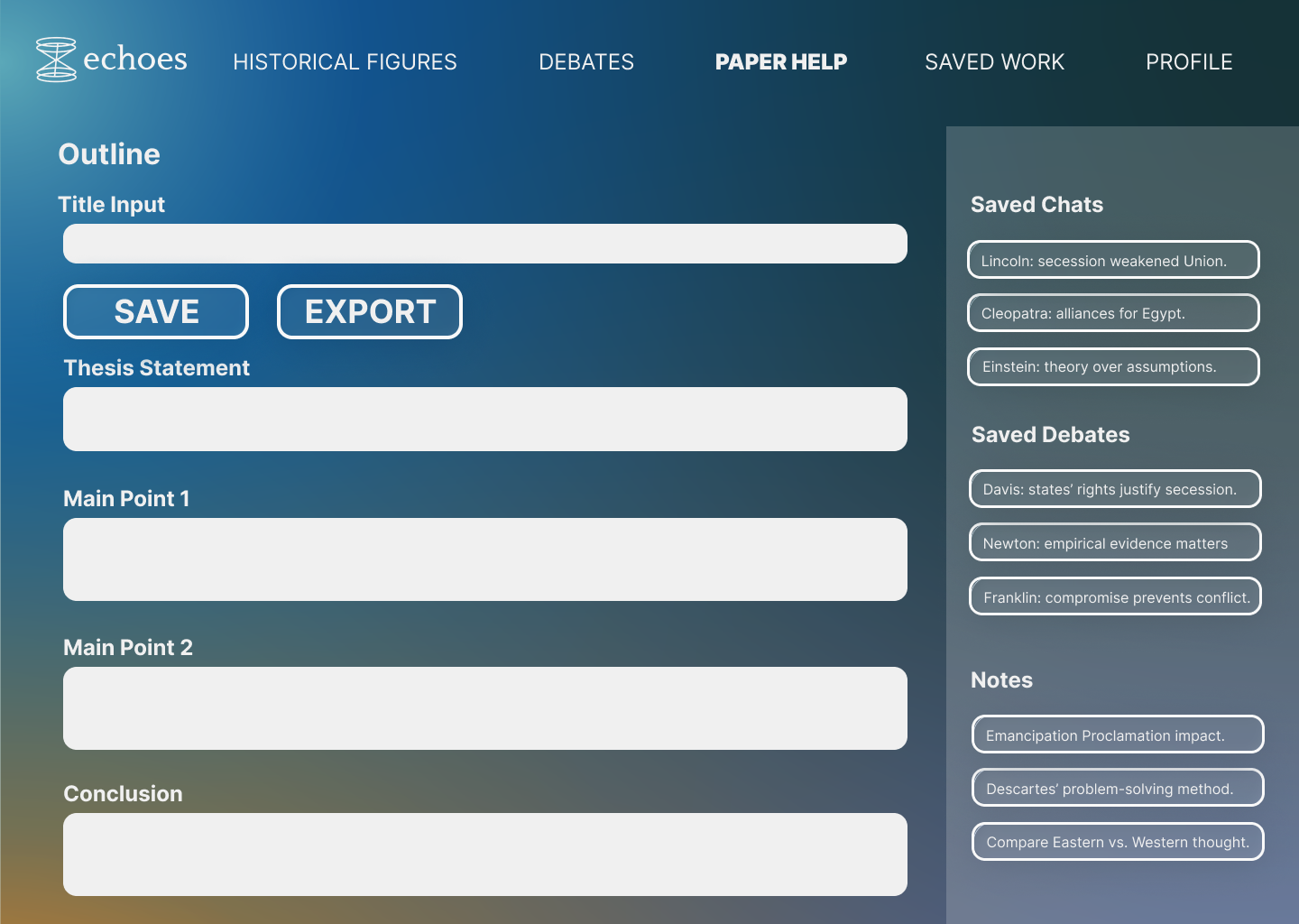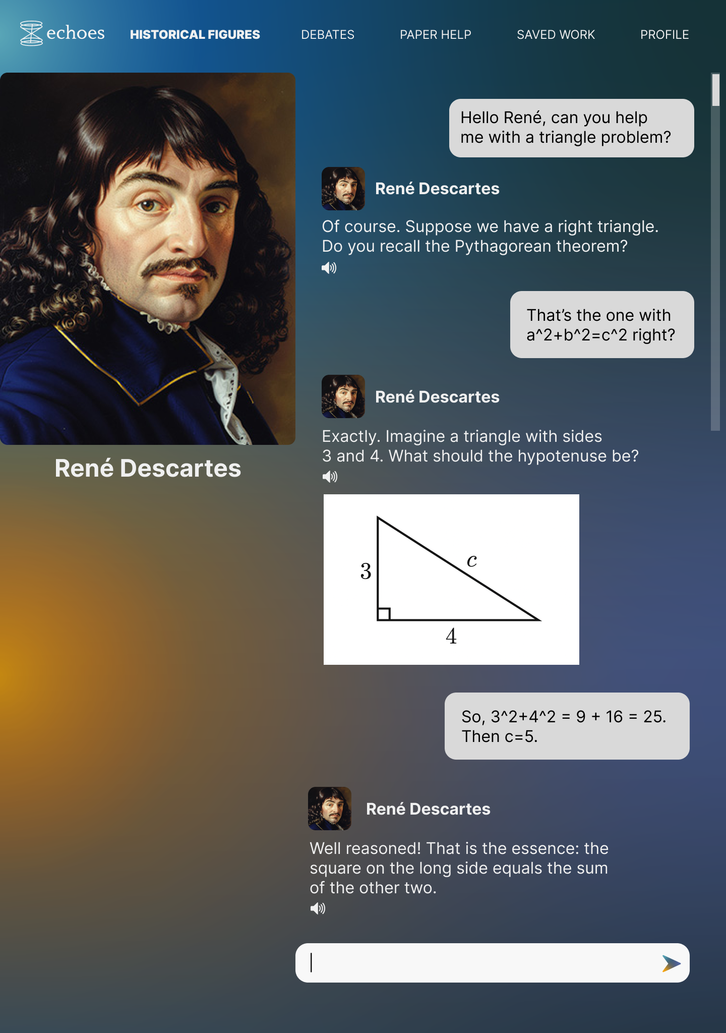 Echoes aims to make learning more interactive by using AI to let students hold real conversations with historical figures. Instead of relying only on lectures or textbooks, students can ask questions, explore topics at their own pace, and follow debates between figures with different viewpoints. The app also saves conversations as study notes, helping students review and stay organized. By turning history into a dialogue, Echoes supports teachers in keeping classes engaging and helping students build deeper understanding.