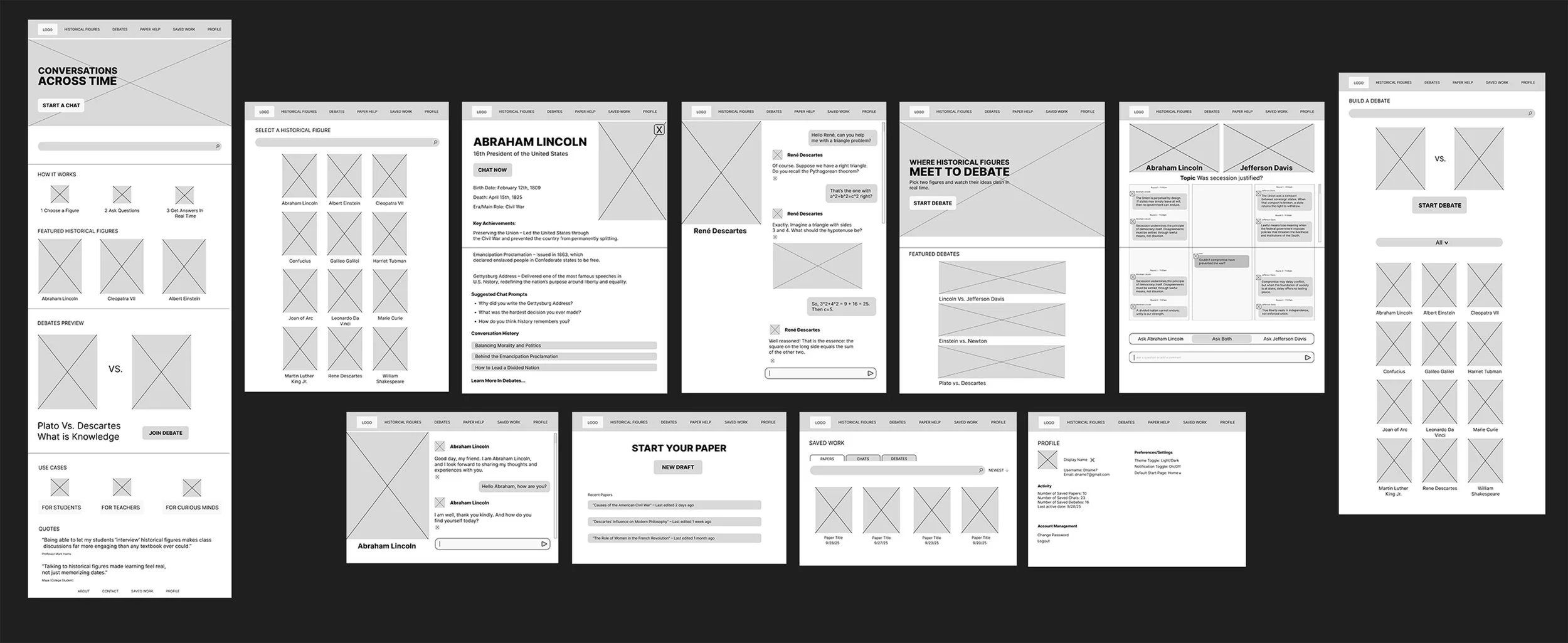The wireframes map out the main flow of Echoes, showing how users select figures, start chats or debates, and access saved work. Each screen is kept simple and focused, helping confirm the core structure and usability before moving into detailed design.