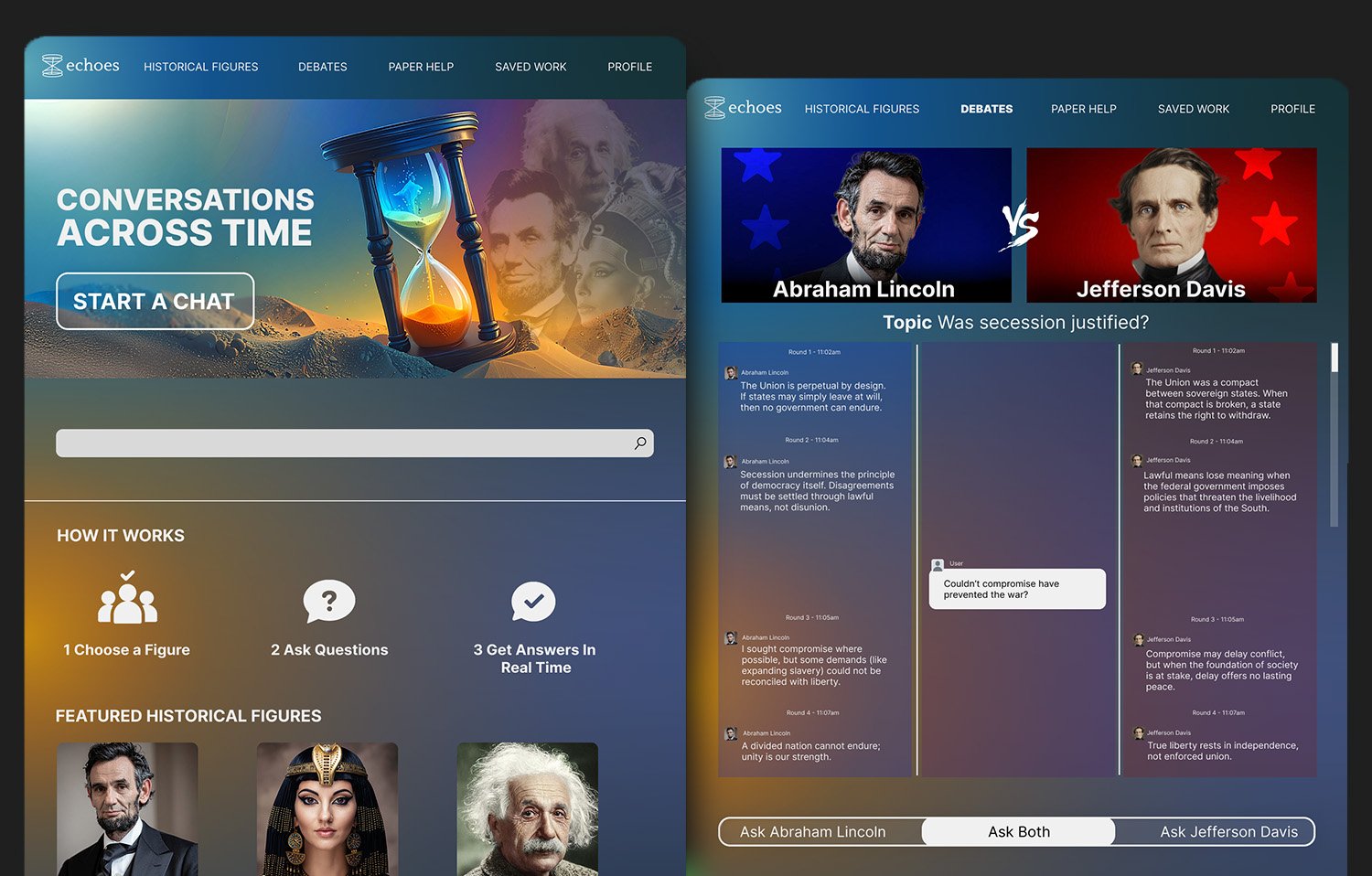 Users need an approachable, interactive way to engage with history and academic topics without feeling overwhelmed. Many struggle to connect with traditional resources that feel dense or distant, and they want clear explanations, the ability to ask questions freely, and personalized support for their assignments. Echoes meets these needs by making historical knowledge conversational, responsive, and easy to access.